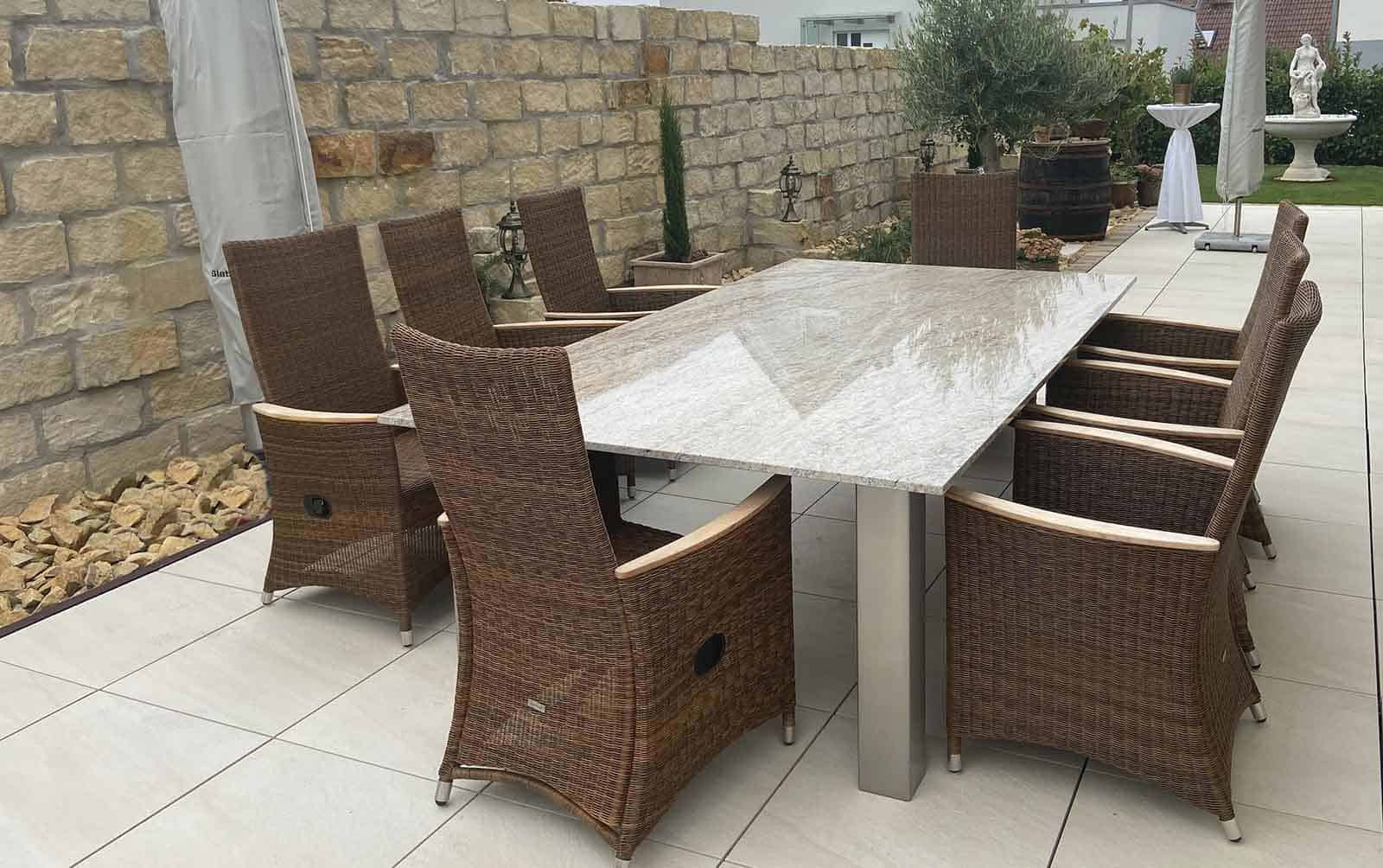 Terrassentische mit Granitplatte sind Wetterhart und können ohne Probleme im freien überwintern. Der Pflegaufwand ist bei dem robusten Material sehr gering.
